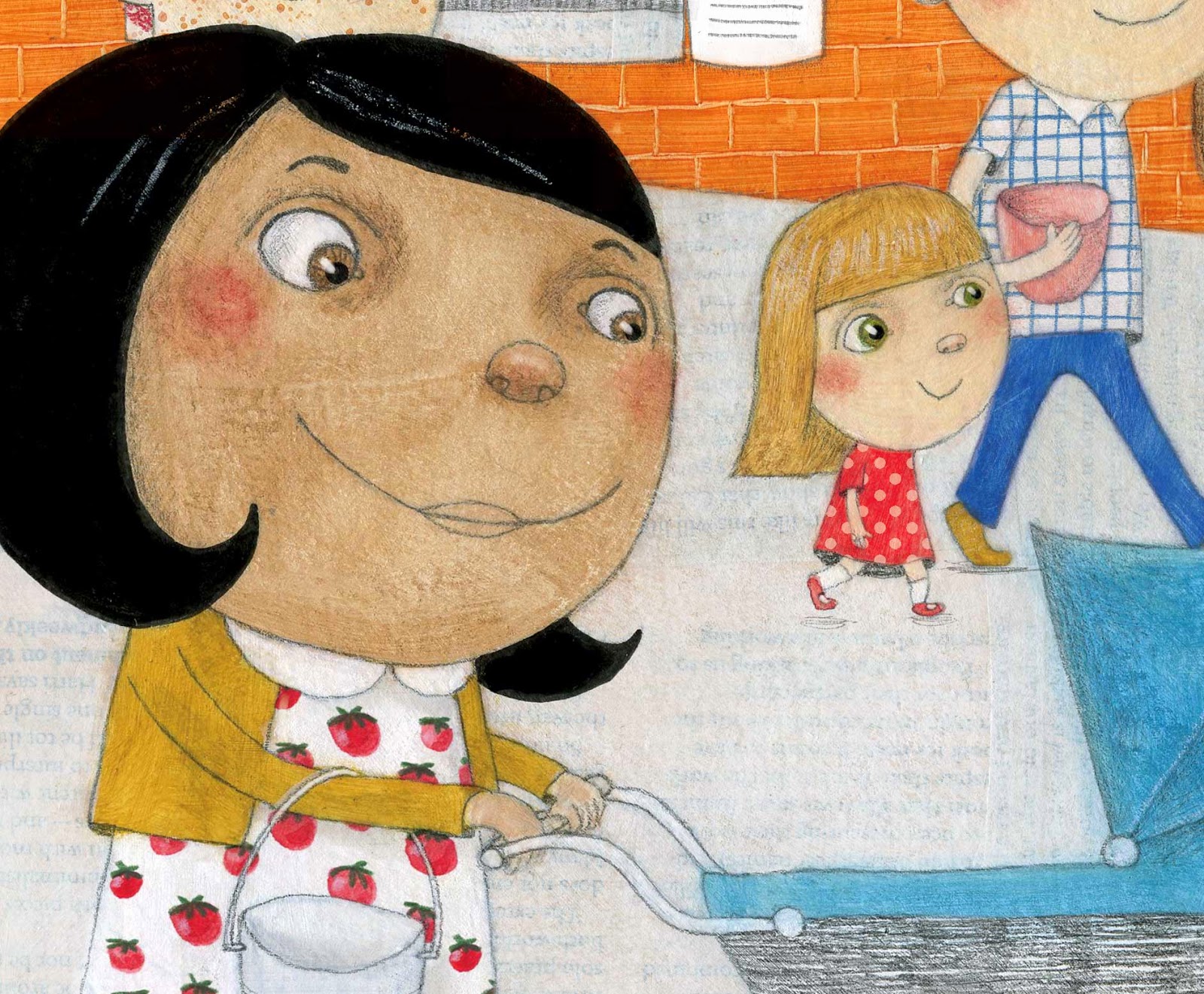 The little boy pulling the wagon is actually based on my husband. He used to work for Apple as an iPhone technician and wore a dark blue shirt with an apple on it. I lightened the shirt and substituted a different kind of fruit. I'd also like to draw your attention to the words on the side of the wagon. My husband's name is Dario.